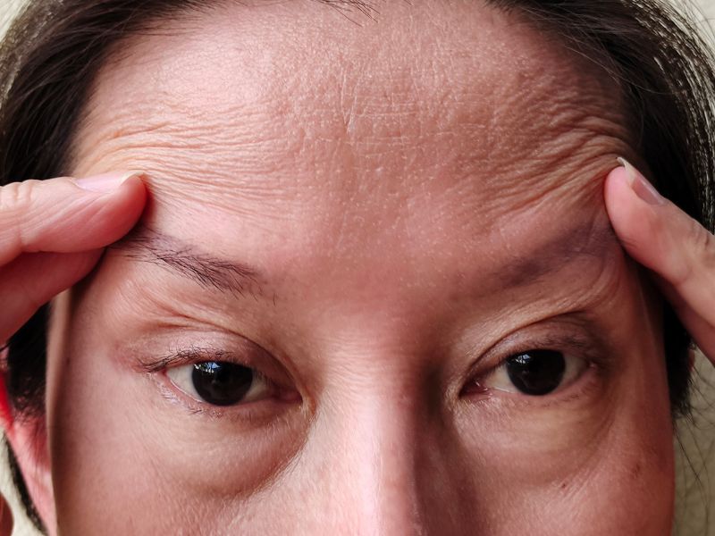 - Nếp nhăn và chảy xệ: Nếp nhăn quanh mắt, miệng hay trán là triệu chứng sớm của việc mất collagen và elastin. Da không còn căng mịn, dễ chảy xệ nhất là vùng quai hàm, khóe miệng.
